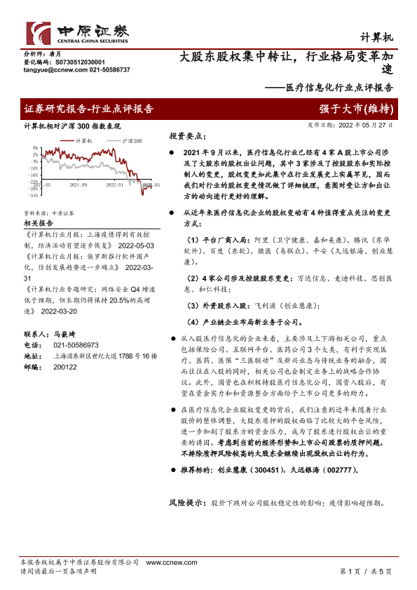 【中原证券】【20220527】医疗信息化行业点评报告:大股东股权集中转让,行业格局变革加速-5页