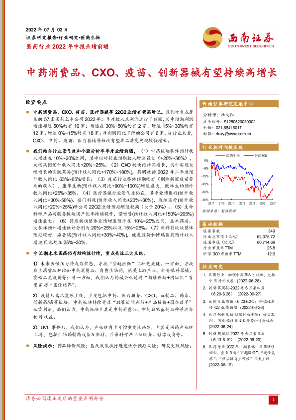 医药行业 中药消费品 中报业绩 创新器械 CXO