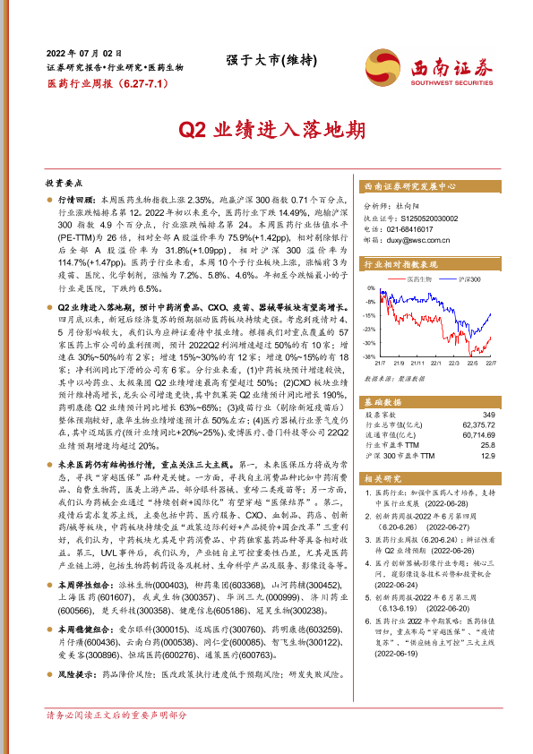 【西南证券】【20220702】医药行业周报:Q2业绩进入落地期-39页