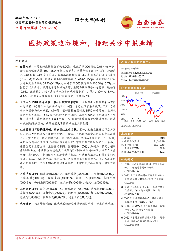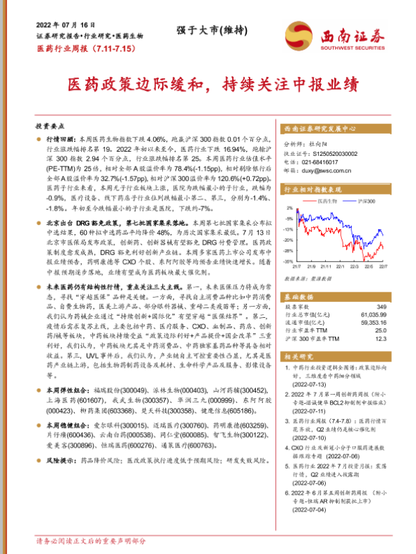 【西南证券】【20220716】医药行业周报:医药政策边际缓和,持续关注中报业绩-40页