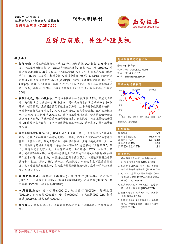 【西南证券】【20220730】医药行业周报:反弹后筑底,关注个股良机-36页