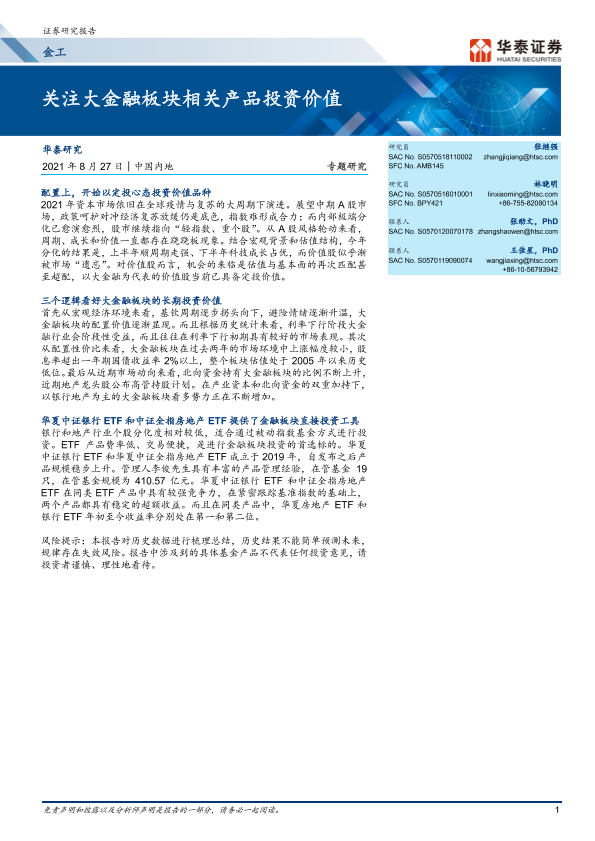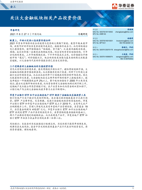 【华泰证券】【20210827】金工: 关注大金融板块相关产品投资价值-19页