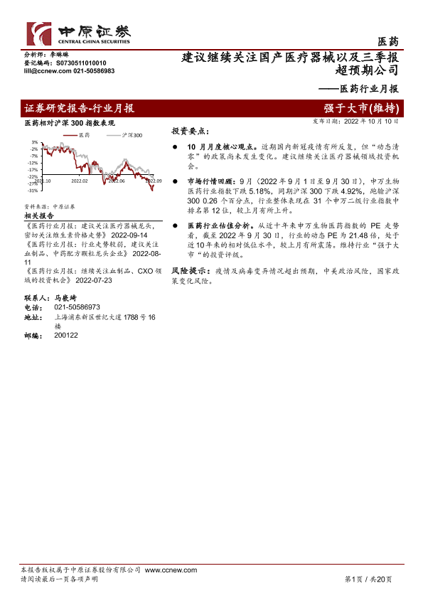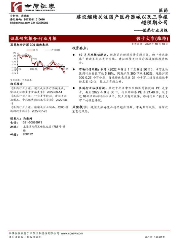 【中原证券】【20221010】医药行业月报:建议继续关注国产医疗器械以及三季报超预期公司-20页