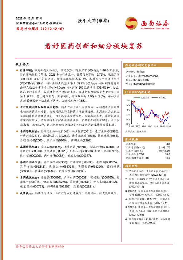 【西南证券】【20221217】医药行业周报:看好医药创新和细分板块复苏-44页