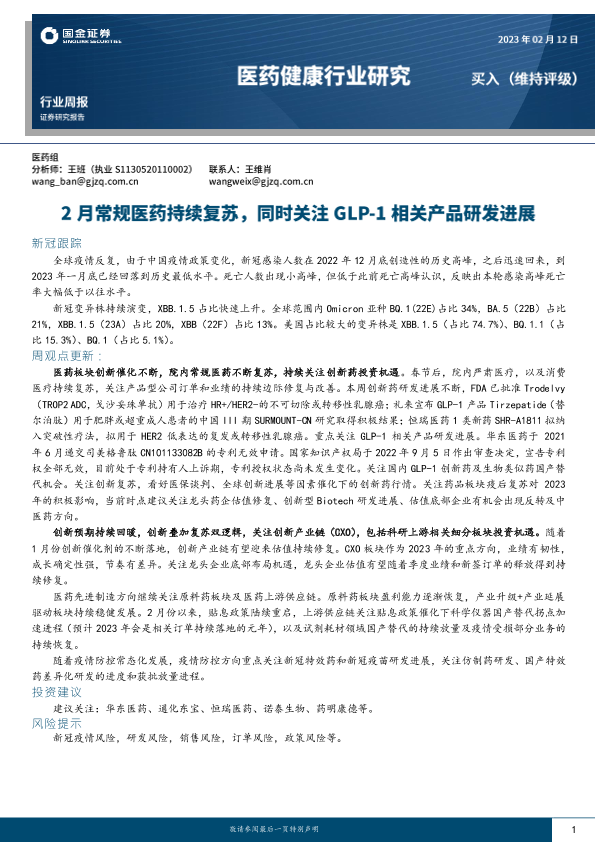 【国金证券】【20230212】2月常规医药持续复苏,同时关注GLP-1相关产品研发进展-15页