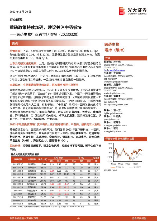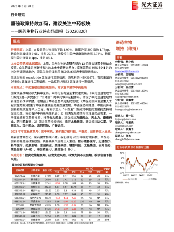【光大证券】【20230320】医药生物行业跨市场周报:重磅政策持续加码,建议关注中药板块-26页