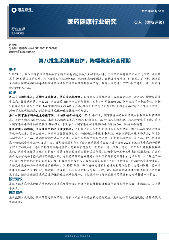 【国金证券】【20230330】第八批集采结果出炉,降幅稳定符合预期-10页