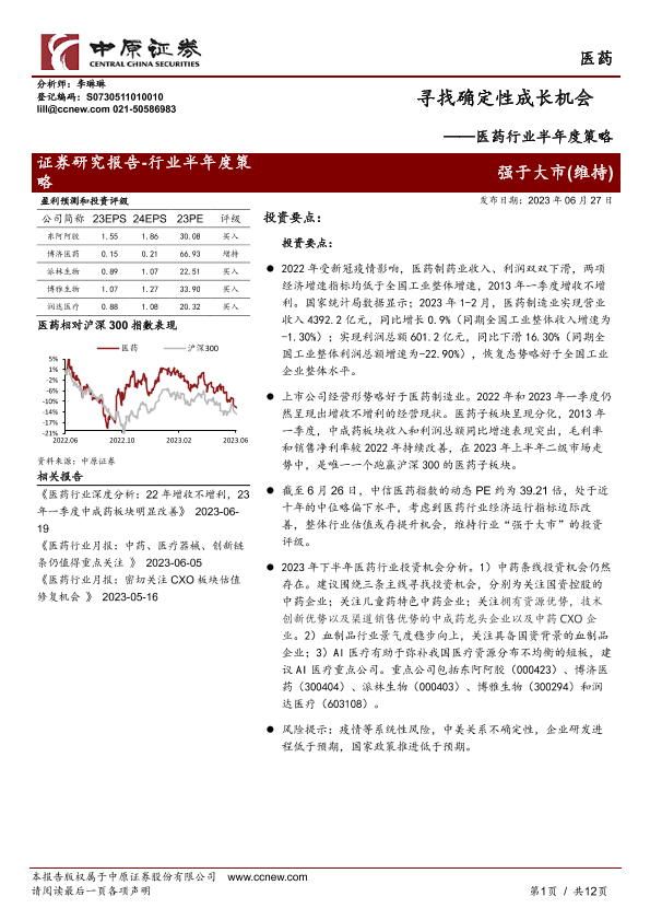 【中原证券】【20230627】医药行业半年度策略:寻找确定性成长机会-12页