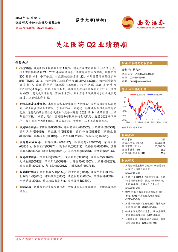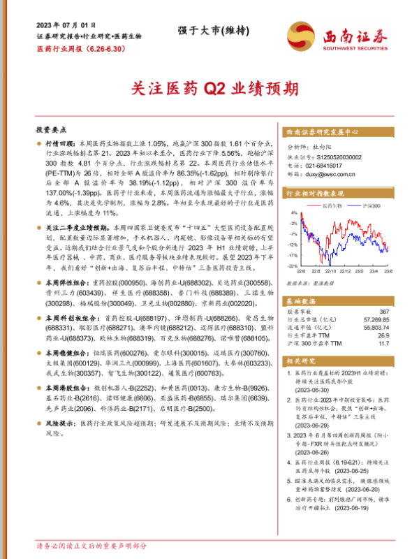 【西南证券】【20230701】医药行业周报:关注医药Q2业绩预期-34页