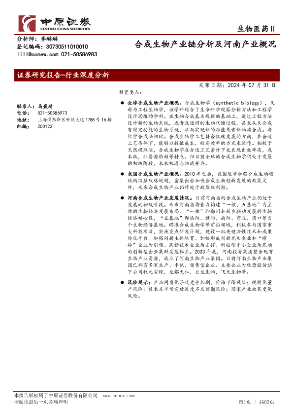 【中原证券】【20240731】生物医药Ⅱ:合成生物产业链分析及河南产业概况-82页