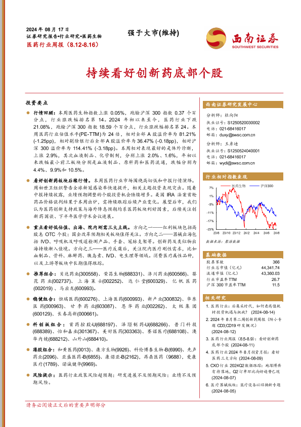 【西南证券】【20240817】医药行业周报:持续看好创新药底部个股-35页