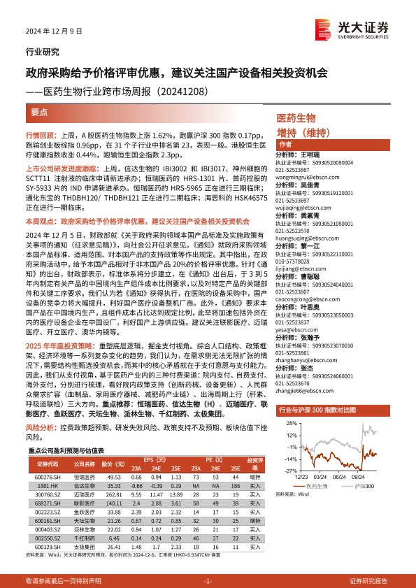 【光大证券】【20241209】医药生物行业跨市场周报:政府采购给予价格评审优惠,建议关注国产设备相关投资机会-16页