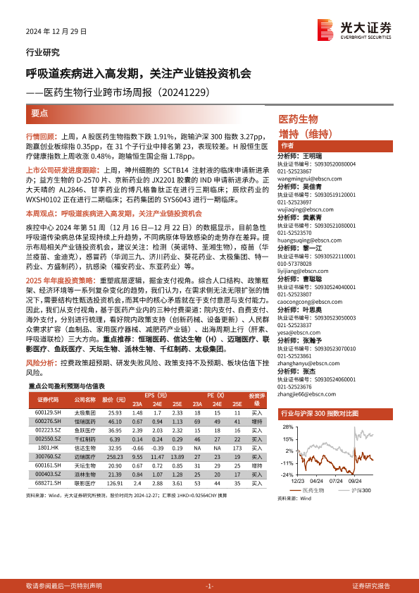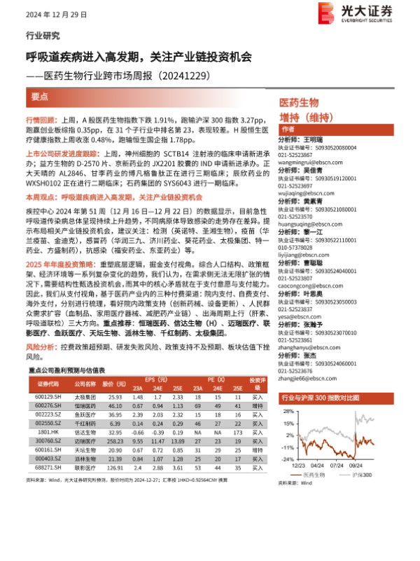 【光大证券】【20241229】医药生物行业跨市场周报:呼吸道疾病进入高发期,关注产业链投资机会-16页
