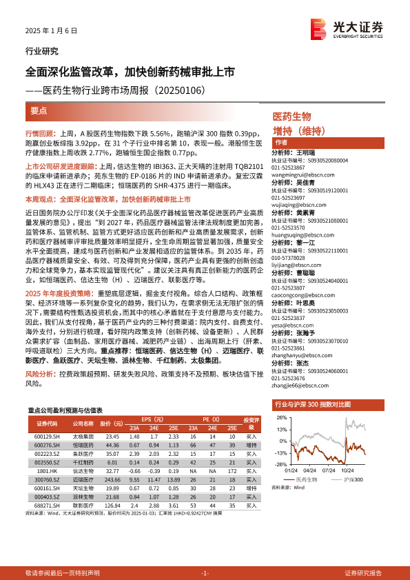【光大证券】【20250106】医药生物行业跨市场周报:全面深化监管改革,加快创新药械审批上市-16页