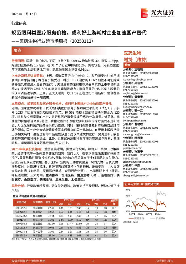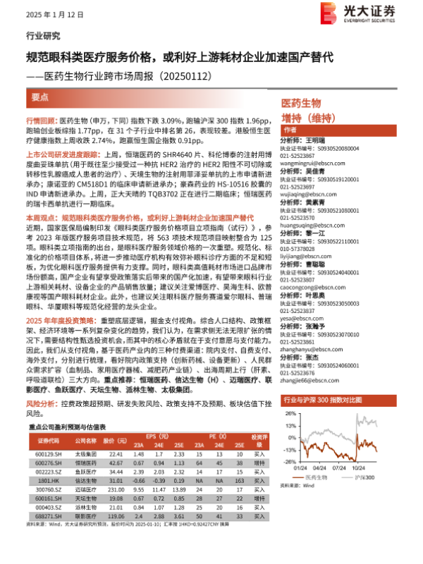 【光大证券】【20250112】医药生物行业跨市场周报:规范眼科类医疗服务价格,或利好上游耗材企业加速国产替代-16页