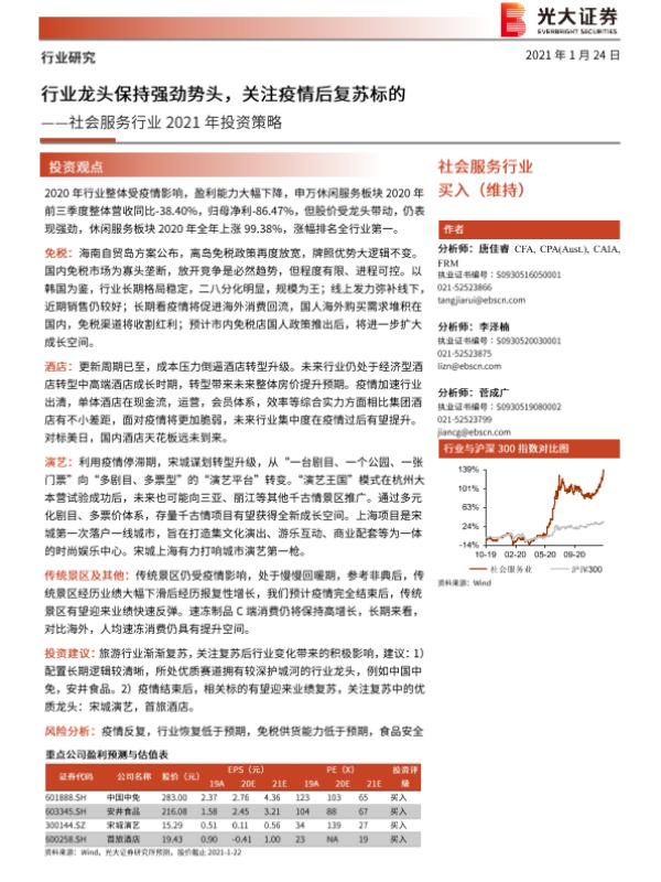 社会服务 免税政策 行业龙头 疫情后复苏 投资策略