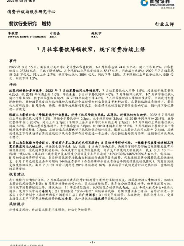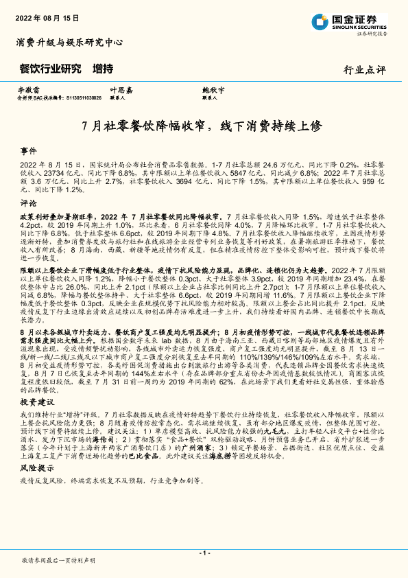 【国金证券】【20220815】7月社零餐饮降幅收窄,线下消费持续上修-6页