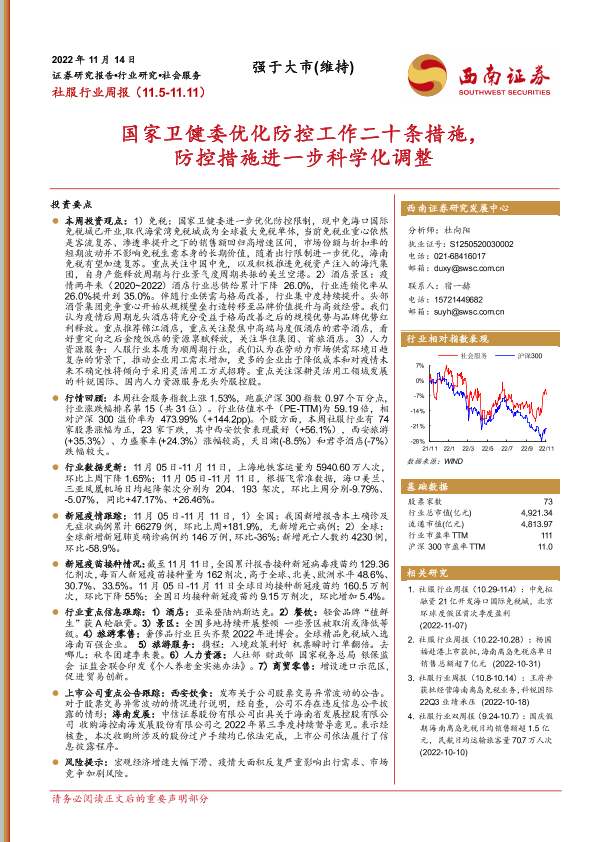 【西南证券】【20221114】社服行业周报:国家卫健委优化防控工作二十条措施,防控措施进一步科学化调整-20页