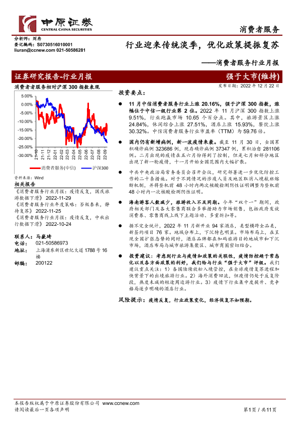 【中原证券】【20221222】消费者服务行业月报:行业迎来传统淡季,优化政策提振复苏-11页