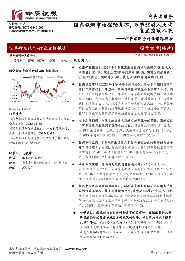 【中原证券】【20230206】消费者服务行业跟踪报告:国内旅游市场强劲复苏-11页
