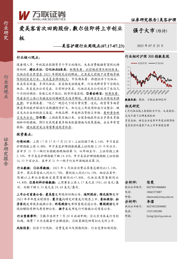 【万联证券】【20230725】美容护理行业周观点:爱美客首次回购股份,敷尔佳即将上市创业板-10页
