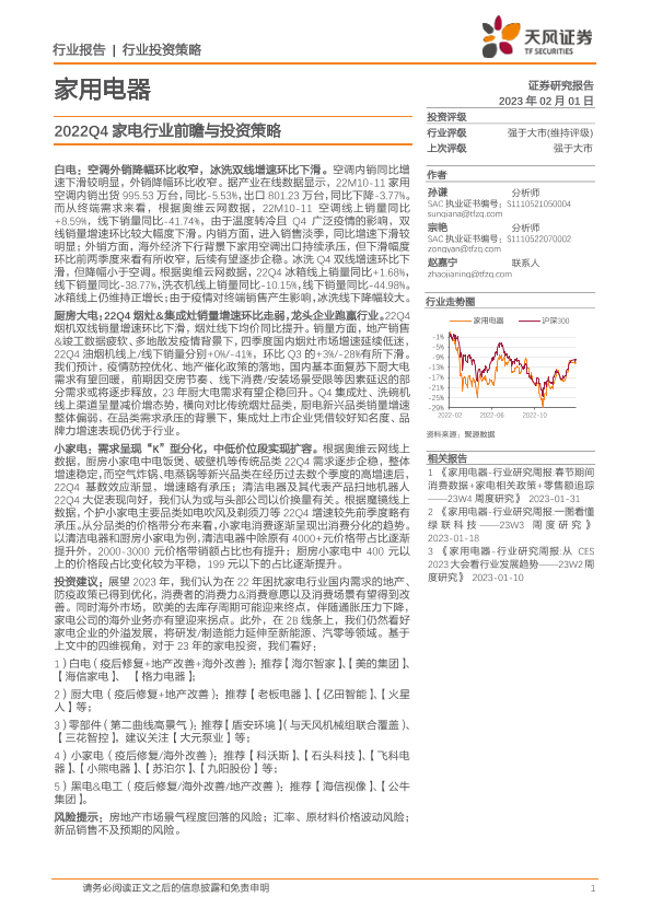 【天风证券】【20230201】家用电器行业投资策略:2022Q4家电行业前瞻与投资策略-18页