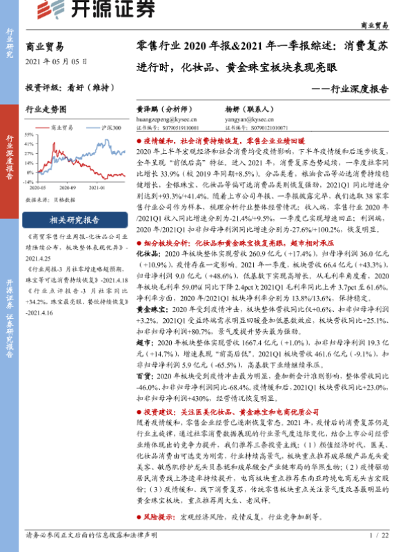 【开源证券】【20210505】零售行业2020年报&2021年一季报综述:消费复苏进行时,化妆品、黄金珠宝板块表现亮眼-22页