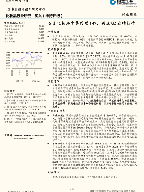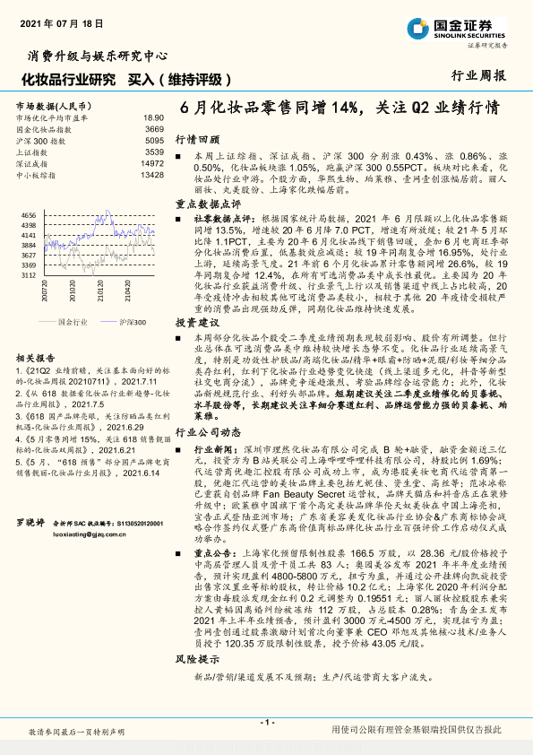 【国金证券】【20210718】6月化妆品零售同增14%,关注Q2业绩行情-11页