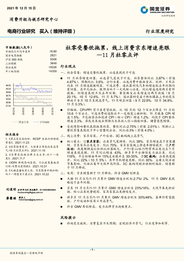 【国金证券】【20211215】11月社零点评-社零受餐饮拖累,线上消费京东增速亮眼-22页