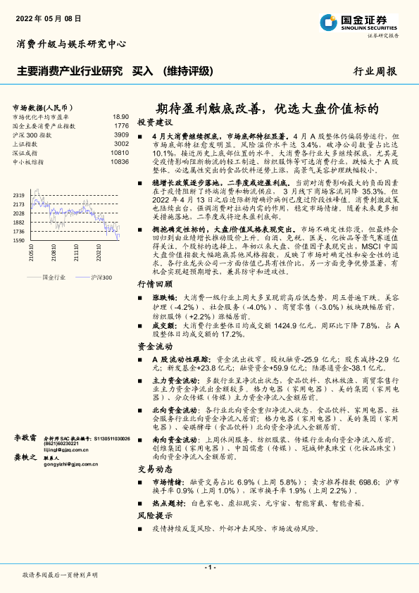 【国金证券】【20220508】主要消费产业行业研究:期待盈利触底改善,优选大盘价值标的-18页