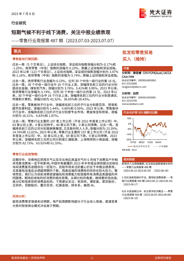 【光大证券】【20230708】零售行业周报第487期:短期气候不利于线下消费,关注中报业绩表现-11页