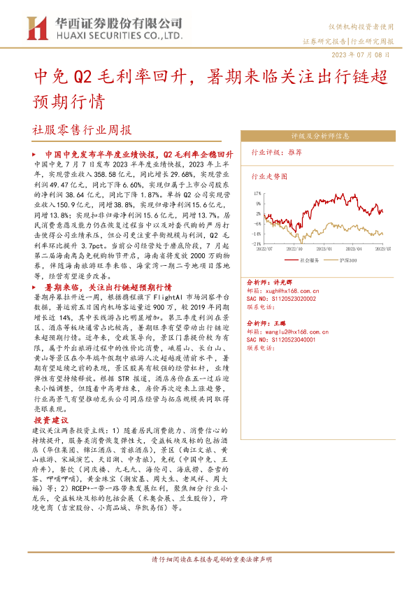 【华西证券】【20230708】社服零售行业周报:中免Q2毛利率回升,暑期来临关注出行链超预期行情-11页