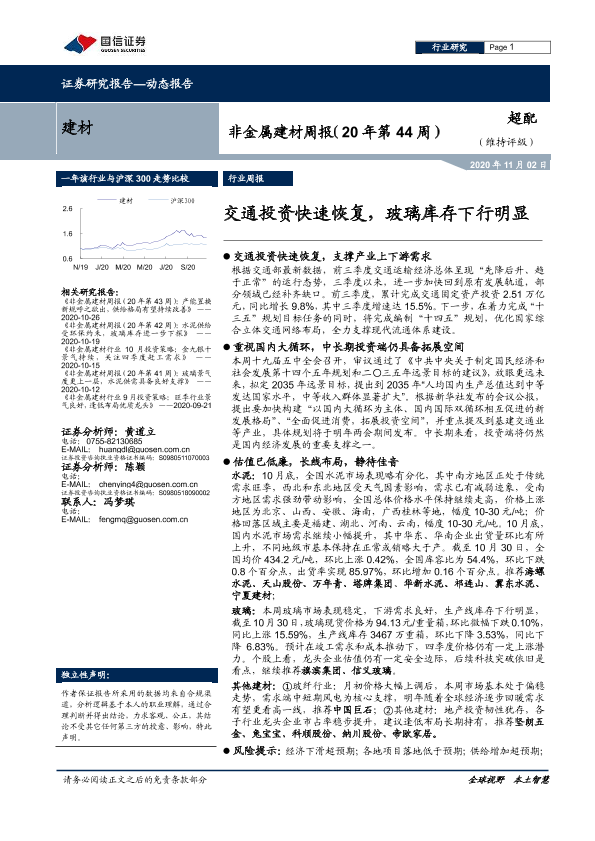 【国信证券】【20201102】非金属建材周报:交通投资快速恢复,玻璃库存下行明显-17页