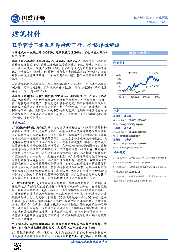 【国盛证券】【20201109】建筑材料行业周报:旺季背景下水泥库存持续下行,价格弹性增强-24页