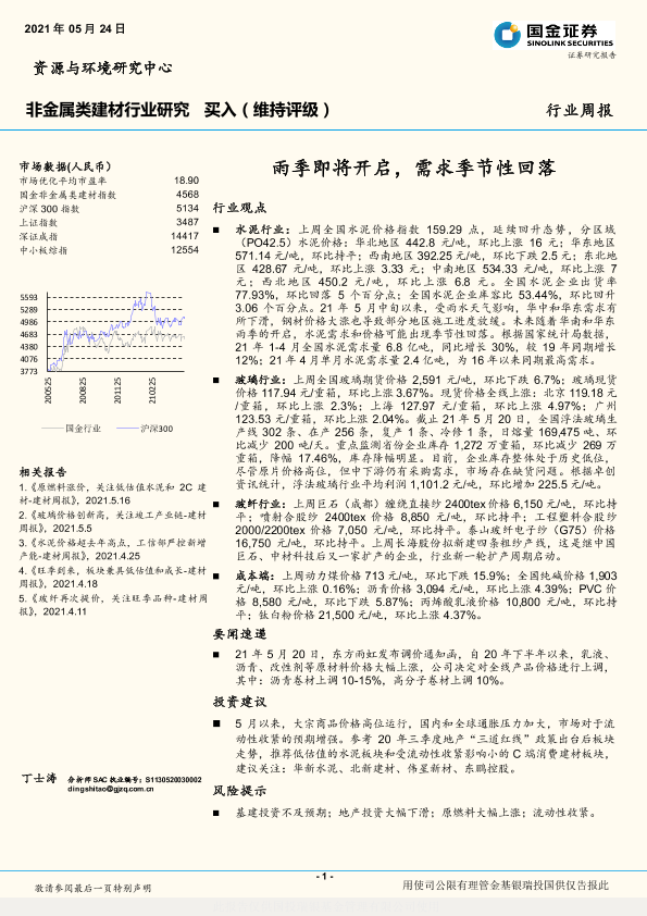 【国金证券】【20210524】非金属类建材行业研究:雨季即将开启,需求季节性回落-8页