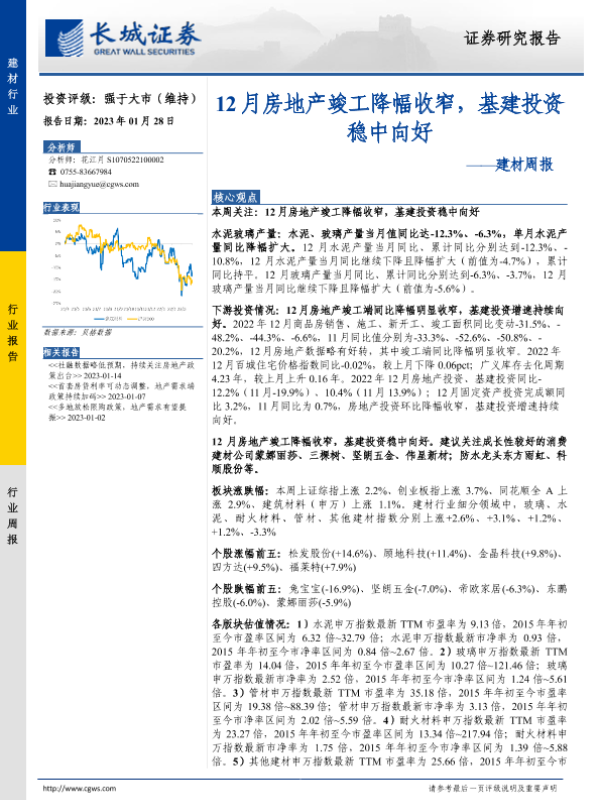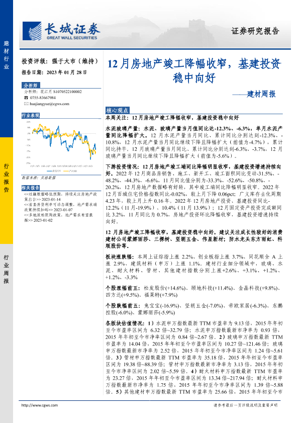 【长城证券】【20230128】建材周报:12月房地产竣工降幅收窄,基建投资稳中向好-23页