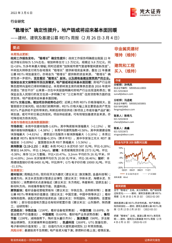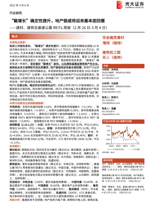 【光大证券】【20220306】建材、建筑及基建公募REITs周报:“稳增长”确定性提升,地产链或将迎来基本面回暖-15页