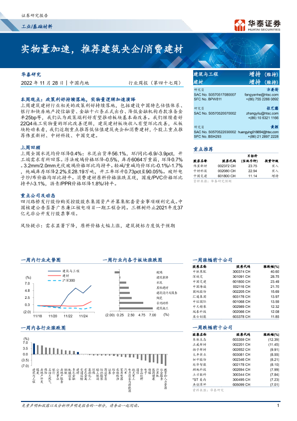 【华泰证券】【20221128】工业基础材料行业周报:实物量加速,推荐建筑央企 消费建材-15页