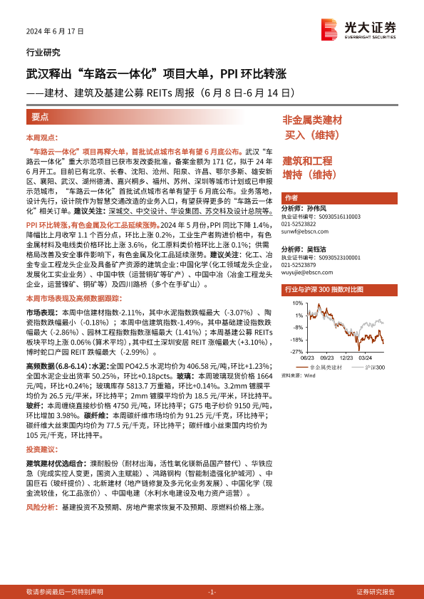 【光大证券】【20240617】建材、建筑及基建公募REITs周报:武汉释出“车路云一体化”项目大单,PPI环比转涨-18页