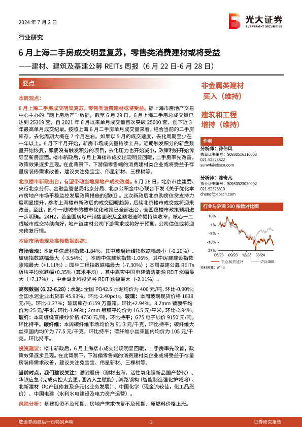 【光大证券】【20240702】建材、建筑及基建公募REITs周报:6月上海二手房成交明显复苏,零售类消费建材或将受益-17页