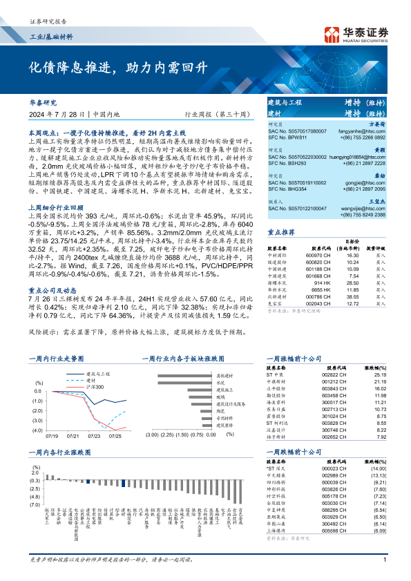【华泰证券】【20240728】工业基础材料行业周报:化债降息推进,助力内需回升-16页