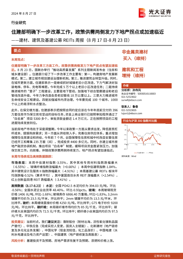 【光大证券】【20240827】建材、建筑及基建公募REITs周报:住建部明确下一步改革工作,政策供需两侧发力下地产拐点或加速临近-17页