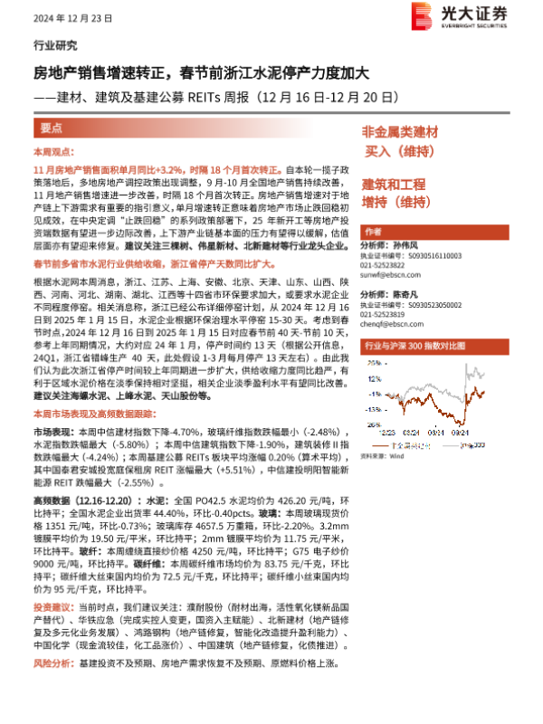 【光大证券】【20241223】建材、建筑及基建公募REITs周报:房地产销售增速转正,春节前浙江水泥停产力度加大-17页