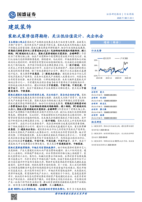 【国盛证券】【20200823】建筑装饰行业周报:装配式装修值得期待,关注低估值设计、央企机会-16页