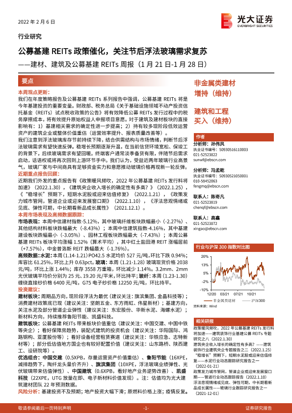 【光大证券】【20220206】建材、建筑及公募基建REITs周报:公募基建REITs政策催化,关注节后浮法玻璃需求复苏-16页