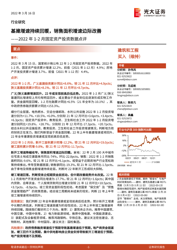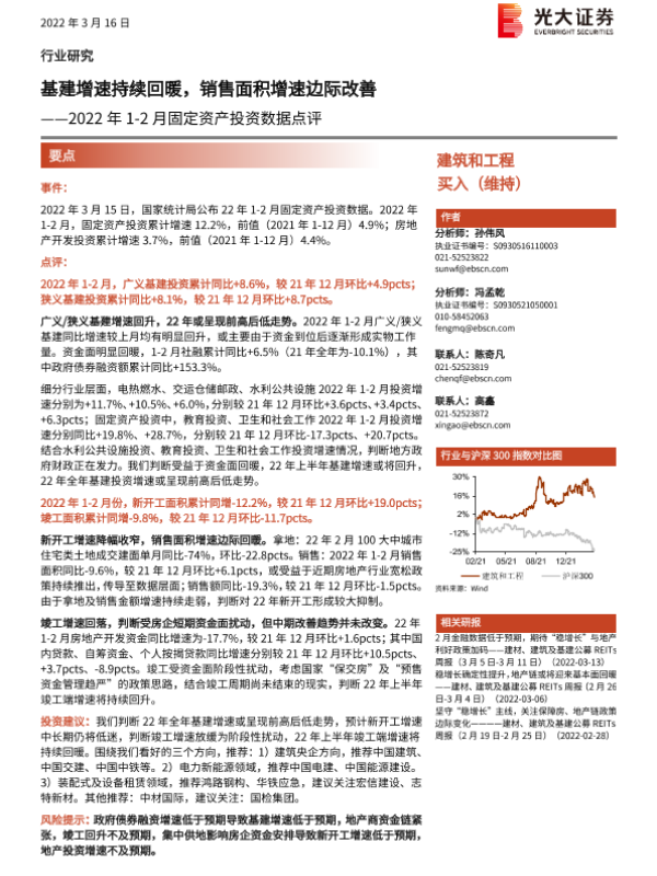 【光大证券】【20220316】2022年1-2月固定资产投资数据点评-基建增速持续回暖,销售面积增速边际改善-8页