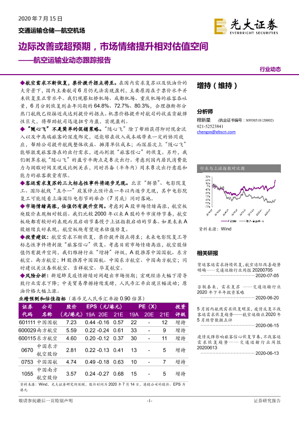 【光大证券】【20200715】航空运输业动态跟踪报告:边际改善或超预期,市场情绪提升相对估值空间-11页