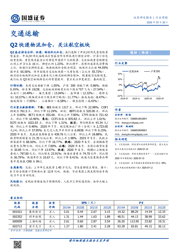 【国盛证券】【20200726】Q2快递物流加仓,关注航空板块-22页