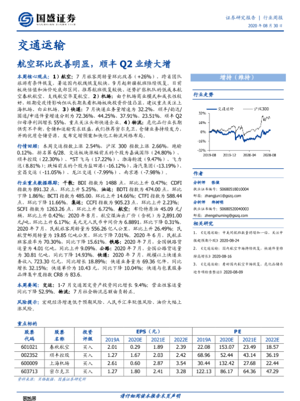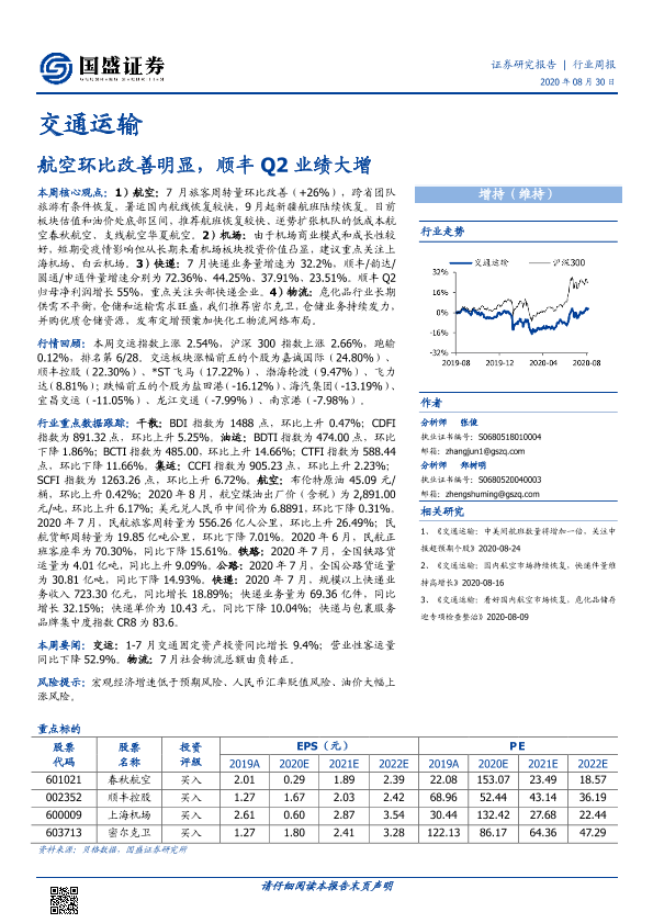 【国盛证券】【20200830】交通运输行业周报:航空环比改善明显,顺丰Q2业绩大增-22页