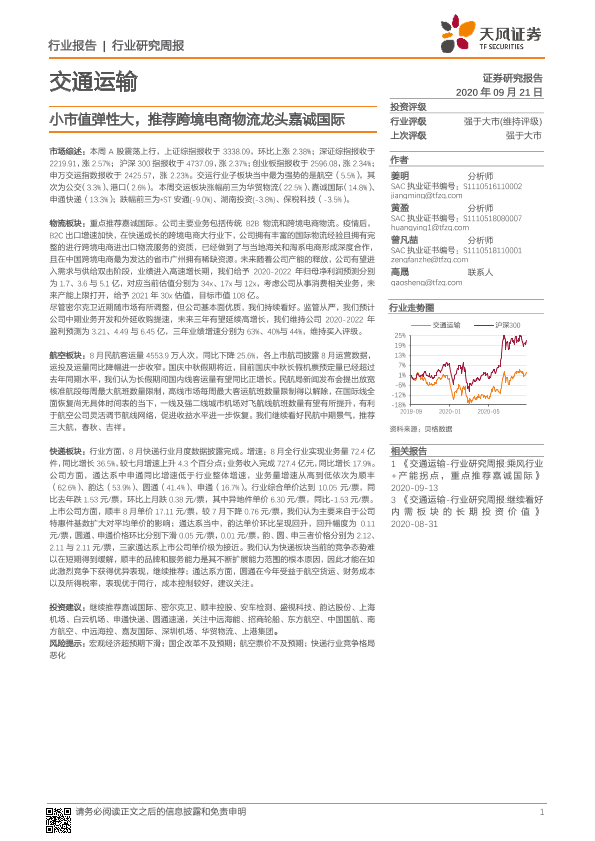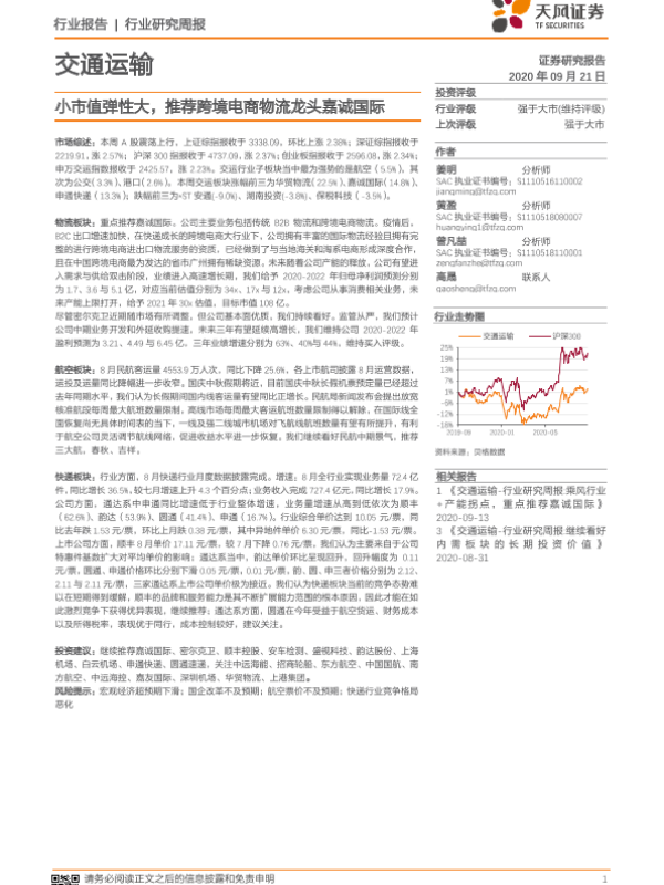 【天风证券】【20200921】交通运输行业研究周报:小市值弹性大,推荐跨境电商物流龙头嘉诚国际-14页